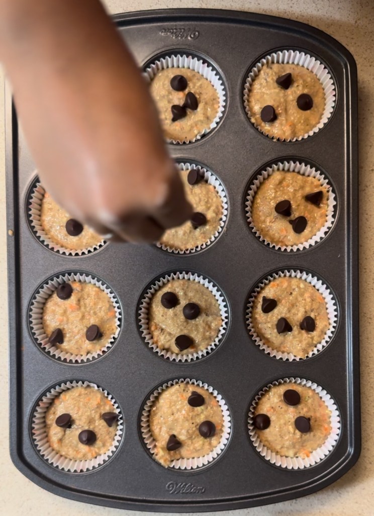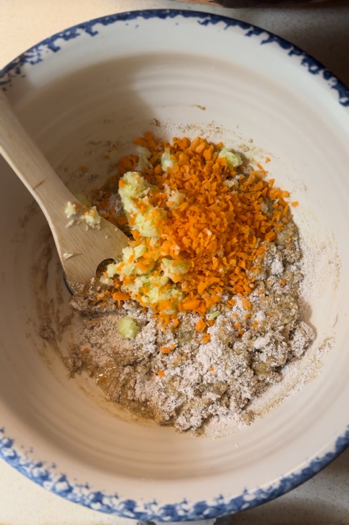 - Add your carrots and zucchini and then fold these in until they’re fully incorporated and there are no dry spots in the batter.